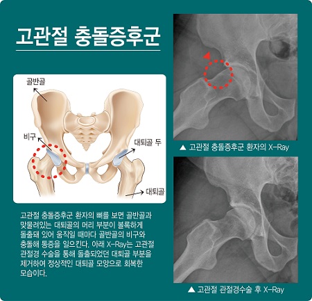 고관절 충돌증후군은 볼과 소켓 모양으로 서로 맞물려 움직이는 골반 뼈와 허벅지 뼈가 후천적으로 변형되거나 선천적으로 다르게 생겨 움직일 때마다 통증을 일으킨다.