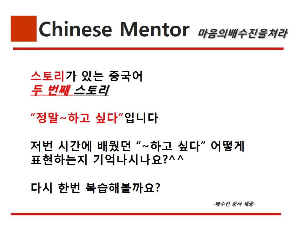배수진 강사의 스토리가 있는 중국어 【서울=코리아뉴스타임즈】배수진 강사 = '스토리가 있는 중국어 수업'은 매주 월요일 새로운 이야기로 여러분을 찾아갑니다. 배수진 강사 leokujini@naver.com 저작권자 © 뉴스인 무단전재 및 재배포 금지 당신만 안 본 뉴스 한국 야구 대표팀, 한일 첫 평가전서 4-11 완패...韓日전 10연패 좋아하는 방송 1위: tvN 주말 드라마 '태풍상사' 3.6%...2위, ENA·SBS Plus '나는 SOLO' 2.9% 한국어린이집총연합회, 농협경기본부와 업무협약 체결 죽전테라스앤139 단지서 유치권자 폭행·점유 침탈 의혹…교보자산신탁 고용 용역 개입 논란 “현실과 환상 사이, 우리는 무엇을 상상하는가” 송가인·김준수, 오는 24일 국악방송 ‘ 이세준의 음악이 좋은 밤’ 출연 미세조류 기반 공기정화기 ‘트리브링’, LRQA에서 탄소저감 효과 공식 검증 한국 야구 대표팀, 한일 첫 평가전서 4-11 완패...韓日전 10연패 댓글삭제 삭제한 댓글은 다시 복구할 수 없습니다. 그래도 삭제하시겠습니까? 비밀번호 닫기 기사 댓글 0 댓글 접기 댓글입력 권한이 없습니다. 댓글 내용입력 비회원 로그인 이름 비밀번호 댓글 내용입력 댓글쓰기 계정을 선택하시면 로그인·계정인증을 통해 댓글을 남기실 수 있습니다. 회원 로그인 이름 비밀번호 자동등록방지 로그인 옵션 창닫기 주요기사 한미 관세협상 3500억 달러 투자 관리 특별법 발의...車·부품 관세 11월1일자 소급적용 충족 JW중외제약, 정제형 대장정결제 ‘제이클 정’ 심포지엄 성료 70세 이상 낙상환자 2배↑…중앙손상관리센터, 예방 전문가 양성 박차 독감 유행 속, 지금이라도 백신 접종해야 제일파마홀딩스, 계열사 통합 CP운영위원 정기 간담회 개최 동서식품, ‘포스트 그래놀라’ 살구 아몬드•피칸 2종 출시