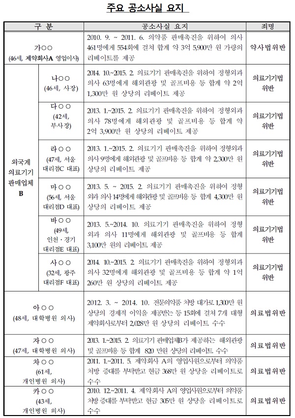 또한 검찰은 "리베이트 제공자 외에 수수자까지 처벌토록 하는 이른바 '쌍벌제'가 시행된 지 5년이 지났음에도 일부 의사들이 여전히 불법 관행에서 벗어나지 못하고 적극적으로 리베이트를 요청하는 사례까지 있음이 드러났다"고 밝혔다.