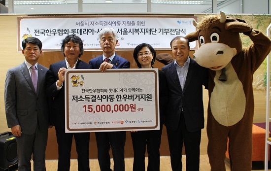 롯데리아(대표 노일식)가 지난 23일 서울시청 복지기획관실에서 전국 한우협회와 함께 서울시 복지재단 측에 한우불고기버거 제품 교환권 기부 전달식을 진행했다.