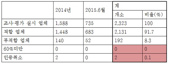 국회 보건복지위원회 최동익 의원(새정치민주연합)은 지난해부터 지난 6월까지 정기평가를 받은 축산물 해썹 인증업체 2323곳 중 부적합 처분을 받은 업체는 192곳이지만 이 중 60% 미만의 점수를 받은 곳은 한 곳도 없는 것으로 드러났다고 10일 밝혔다.