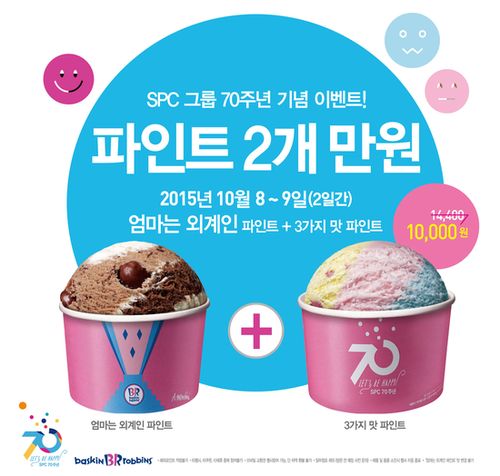 8일 SPC그룹 비알코리아가 운영하는 배스킨라빈스는 SPC그룹 창립 70주년을 맞아 10월 8~9일 양일 간 파인트 사이즈 아이스크림 2개를 1만원에 제공하는 'SPC 70주년 기념 파인트 2개 만원 프로모션'을 한다고 밝혔다.