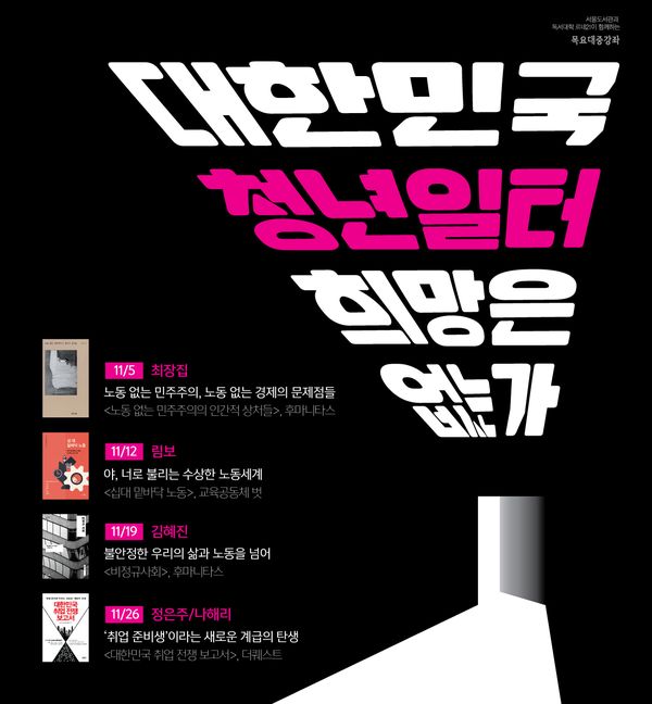 목요대중강좌는 매월 주제를 정하고 그와 관련있는 도서를 선정해 저자가 직접 강의하는 방식으로 진행되는데 11월에는 열정페이, 최저임금, 아르바이트와 비정규직 등으로 상처받고 있는 대한민국 청년들의 현주소를 들여다보고 해결책을 모색하는 방향으로 진행된다.