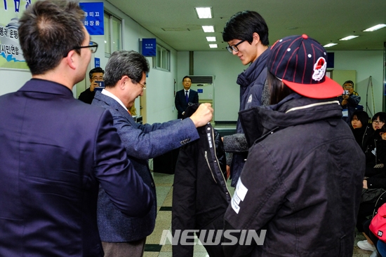 2일 오후 인천 제2 국제여객터미널에서 위동페리와 함께 하는 아름다운 동행 '2015 청소년 중국 역사문화 탐방' 출정식이 열려 최장현 위동페리 대표가 학생들에게 점퍼를 입혀주고 있다.