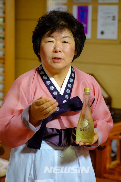 인간문화재 박흥선 명인이 8일 오후 경남 함양 지곡면 솔송주 전시관 '명가원'에서 탐방객들에게 전통가양주 '솔송주'와 증류주 '담솔'에 관해 설명하고 있다.