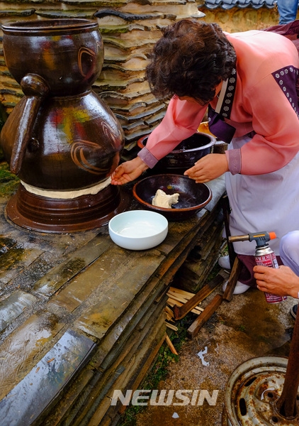 인간문화재 박흥선 명인이 8일 오후 경남 함양 지곡면 솔송주 전시관 '명가원'에서 탐방객들에게 전통주 재조 과정을 보여주고 있다.