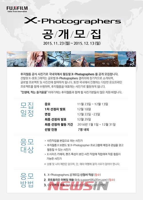 후지필름에는 현재 6명의 X-포토그래퍼가 전 세계 유명 작가들과 함께 세계를 무대로 활발히 활동하고 있는 만큼 올해 진행되는 X-포토그래퍼스 공개 모집에도 관심이 쏠릴 전망이다.