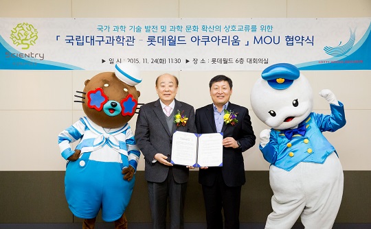 롯데월드(대표 박동기) 아쿠아리움은 24일 국립대구과학관(관장 강신원)과 잠실에 위치한 롯데월드 웰빙센터 6층 대회의실에서 해양과학 교육프로그램 공유 및 해양생물 전시 콘텐츠 강화를 위한 업무협약을 맺었다.