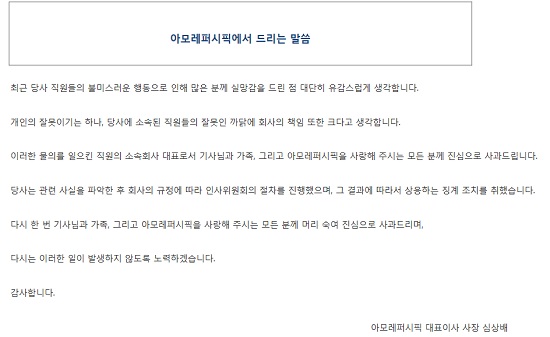 이에 아모레퍼시픽 서경배 대표는 "많은 분께 실망감을 드린 점 대단히 유감스럽게 생각합니다. 개인의 잘못이기는 하나, 당사에 소속된 직원들의 잘못인 까닭에 회사의 책임 또한 크다고 생각합니다"라고 21일 홈페이지를 통해 전했다.