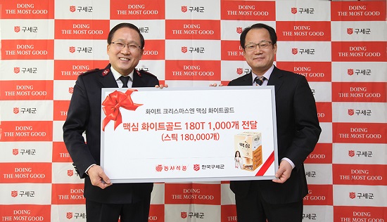 동서식품은 지난 28일 서울시 종로구 소재 구세군회관에서 동서식품 정진 마케팅 팀장과 한국구세군 곽창희 배분본부장이 참석한 가운데 맥심 화이트골드 스틱 18만개를 증정하는 전달식을 가졌다.