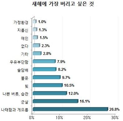 다음은 ▲군살(16.1%) ▲나쁜 버릇, 습관(12%) ▲빚(10.5%) ▲불운(9.7%) ▲술담배(8.2%) ▲우유부단함(7.9%) 등의 순이었다.