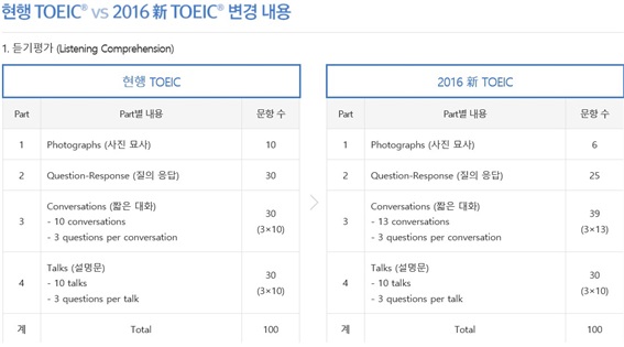 기존 토익시험에서 두 사람의 대화였던 것이 세 사람의 대화가 등장하고 도표나 이미지를 보면서 문제를 푸는 것이 새로운 부분이다.