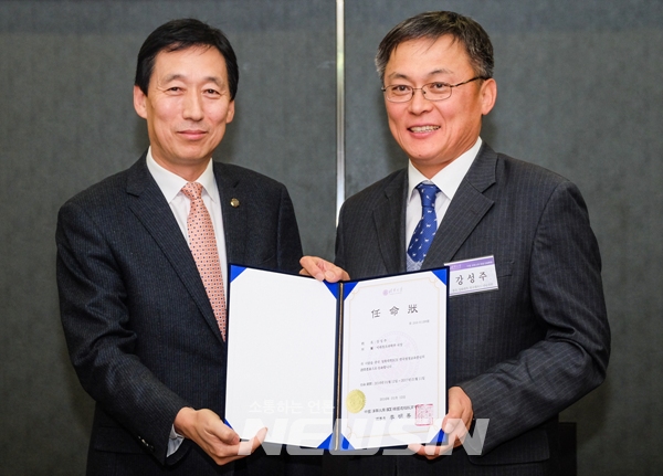 [뉴스인] 민경찬 기자 = 12일 저녁 서울 강남구 삼성동 무역센터 51층 회의실에서 '2016년 칭화대학 한국캠퍼스 고문단' 위촉식이 열려 이명선 이사장(왼쪽)이 미래창조과학부 강성주 국장에게 자문위원 임명장을 전달한 후 기념촬영을 하고 있다.