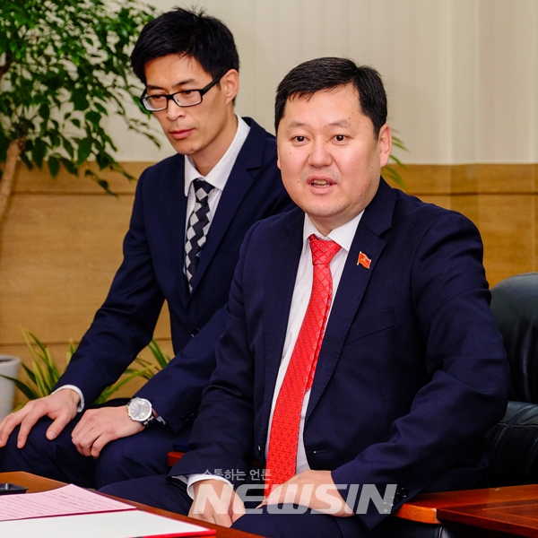 [뉴스인] 민경찬 기자 = 14일 오후 서울 중구 소재 서울시의회를 방문한 케넨바에프 알마즈 비슈케크 시의회 의장(오른쪽)이 박래학 서울시의회 의장을 만나 인사말을 하고 있다.