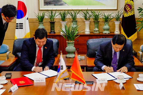[뉴스인] 민경찬 기자 = 14일 오후 서울 중구 소재 서울시의회를 방문한 케넨바에프 알마즈 비슈케크 시의회 의장(왼쪽)이 박래학 서울시의회 의장을 만나 양해각서에 서명하고 있다.