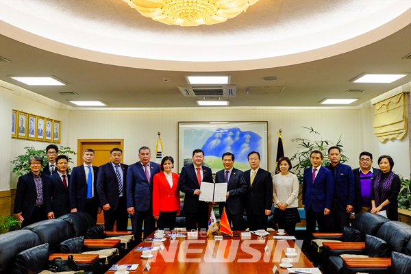 [뉴스인] 민경찬 기자 = 14일 오후 서울 중구 소재 서울시의회를 방문한 케넨바에프 알마즈 비슈케크 시의회 의장(가운데 왼쪽)과 대표단이 서울시의회(의장 박래학)와 양해각서 체결후 기념촬영을 하고 있다.