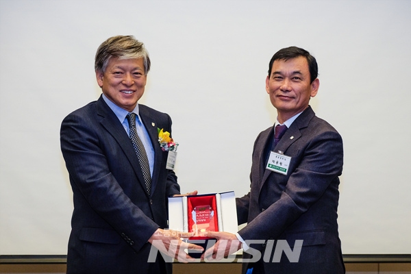 [뉴스인] 민경찬 기자 = 28일 저녁 서울 중구 인현동 PJ 호텔에서 신일고등학교 총동문회가 주최한 제14회 '믿음으로 일하는 자유인'상 시상식이 열려 수상자인 염재호 고려대 총장(왼쪽)이 박용원 신일고 총동문회장으로부터 상을 받고 있다.