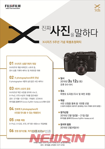 [뉴스인] 민경찬 기자 = 후지필름 일렉트로닉 이미징 코리아(대표 이다 토시히사)가 오는 3월 12일, X 시리즈 5주년 기념 소비자 초청 파티 'X, 진짜 사진을 말하다'를 연다.