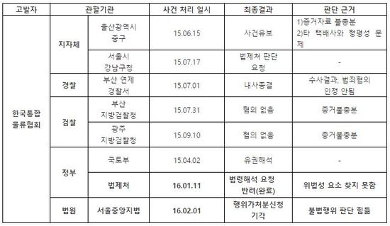 앞서 지난 1월 법제처는 지난해 7월 강남구청이 법제처에 "쿠팡이 로켓배송이라는 서비스명으로 자가용화물자동차(흰색번호판)를 이용해 상품을 배송하는 것이 현행법상 위법인지"에 대한 법령해석 요청 건을 반려한 바 있다.