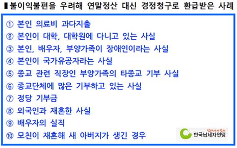 한편 연맹 홈페이지(www.koreatax.org) ‘남들이 놓친 연말정산 사례 찾기 코너’에서 ‘사생활 보호’ 항목에 접속하면 경정청구로 환급을 받은 사례를 찾아볼 수 있다.