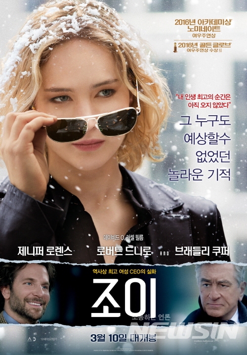 이번에 공개된 메인 포스터는 가난한 싱글맘에서 미국 최고의 여성 CEO로 성공한 조이(제니퍼 로렌스)의 강렬한 모습이 단번에 눈길을 사로잡는다.