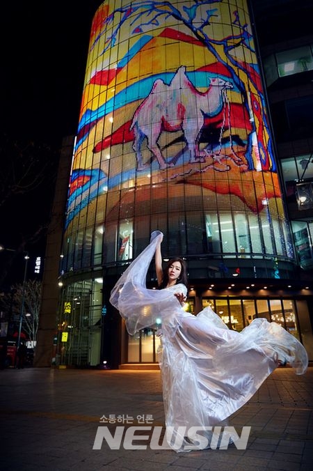 11일 민송아는 다음달부터 시작되는 '미디어 파사드전'을 앞두고, 자신의 그림이 상영되는 서울 중구 초동 명보아트홀 건물 외벽을 배경으로 영상화보 촬영을 진행했다고 전했다.