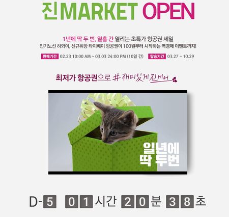 18일 진에어에 따르면 진마켓은 진에어가 국내 항공업계 최초로 백화점 정기세일 개념을 도입해 매년 상·하반기로 나눠 연중 가장 낮은 가격에 항공권을 판매하는 온라인 특가 기획전이다.