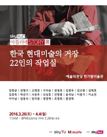 스카이티브이(skyTV, 대표 김영선)의 국내 유일 예술문화 채널 스카이에이앤씨(skyA&C)는 'skyA&C 아틀리에STORY 展'을 다음달 26일부터 4월 4일까지 예술의전당 한가람미술관에서 개최한다고 24일 밝혔다.