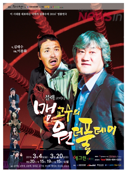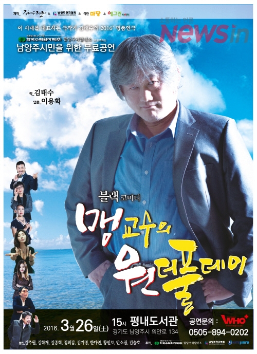 [뉴스인] 김영일 기자 = 블랙코미디 연극 '맹교수의 원더풀데이'(연출 이용화, 작 김태수)가 오는 3월4일부터 20일까지 예그린씨어터에서 공연된다 .3월 26일 오후 3시에는 경기도 남양주시민을 위해 평내도서관에서 무료공연이다.
