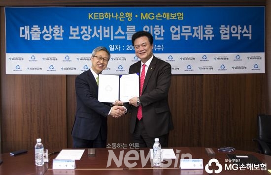 [뉴스인] 최동희 기자 = MG손해보험(대표이사 김상성)은 서울시 역삼 본점에서 KEB하나은행(은행장 함영주)과 '대출상환 보장서비스'를 위한 업무제휴 협약을 체결했다고 10일 밝혔다.