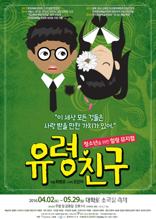 [뉴스인] 김영일 기자 = 대구 중학생 자살 사건, 대전 여고생 자살 사건 등 학생들의 목숨을 앗아가는 학교폭력이 심각한 사회 문제로 떠오르고 있는 지금, 청소년을 위한 힐링 뮤지컬 '유령친구'가 4월2일~5월29일 대학로 소극장 축제에서 재공연을 확정하였다.
