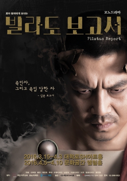 [뉴스인] 김영일 기자 = 작년 5월, 명동 삼일로 창고극장에서 매진 사례를 기록하며 2주 연장 공연을 올렸던 모노드라마 '빌라도 보고서'가 이번엔 대학로로 장소를 옮겨 SH아트홀에서 오는 4월 3일까지 다시 한 번 관객들을 만난다. 4월5일부터 10일까지는 문화공간 엘림홀에서 공연한다.