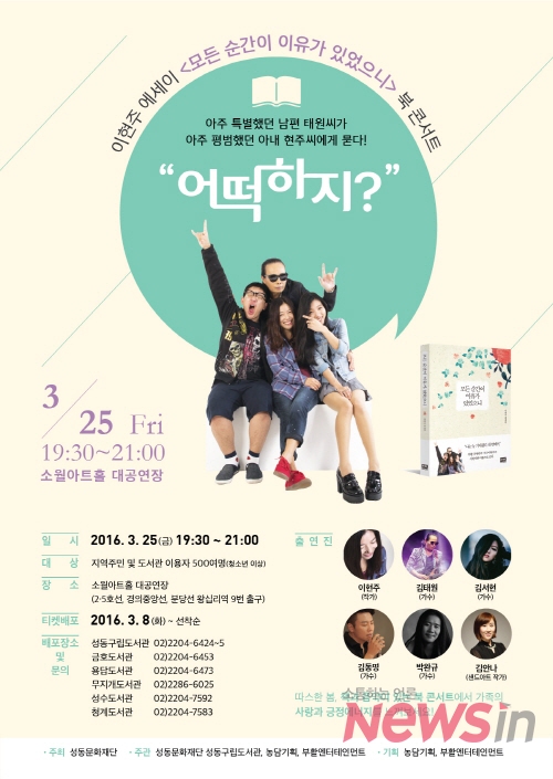 25일 저녁 7시 반부터 소월아트홀 대공연장에서 열리는 북콘서트 ‘어떡하지?’는 재단법인 성동문화재단(이사장 정원오)이 주최해 가족의 사랑과 봄의 따스함을 느낄 수 있도록 했다.