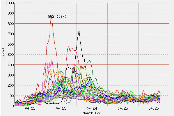 지난 주말 서울 일부 지역의 미세먼지 농도는 '매우 나쁨'의 기준(150㎛/m³)을 훨씬 웃돌아 400㎛/m³ 이상을 기록한 것으로 나타났다.