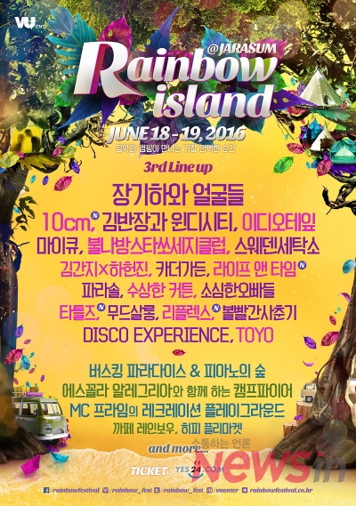 주최사 브이유이엔티는 6월 18일부터 19일까지 1박 2일 동안 경기도 가평군에 위치한 자라섬에서 개최되는 ‘레인보우 아일랜드 뮤직&캠핑 2016’ 공연에 십센치(10cm), 라이프 앤 타임, 타틀즈, 리플렉스 등 3차 라인업을 공개했다.