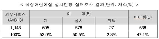 [뉴스인] 김다운 기자 = 근로자들의 보육 지원을 위한 직장어린이집 설치 사업 이행률이 절반 정도에 그치는 것으로 나타났다.
