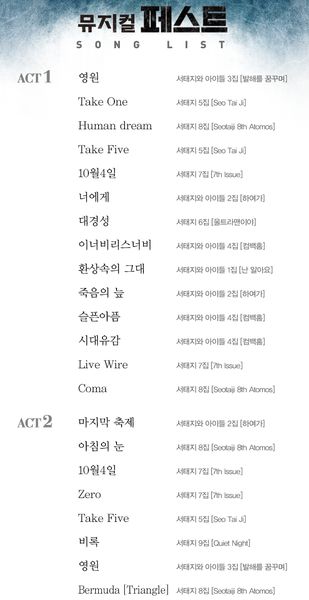또한 뮤지컬 '페스트'의 박진감 넘치는 스토리 속 각 장면들은 ‘환상속의그대’ ‘죽음의늪’ ‘슬픈아픔’ ‘시대유감’ 등 대중적인 서태지 초창기 음악부터 ‘Live Wire’ ‘Coma’ ‘Take Five’ 등 숨겨진 솔로앨범의 명곡에 이르기까지 20여곡의 노래들로 구성 편곡되었다.