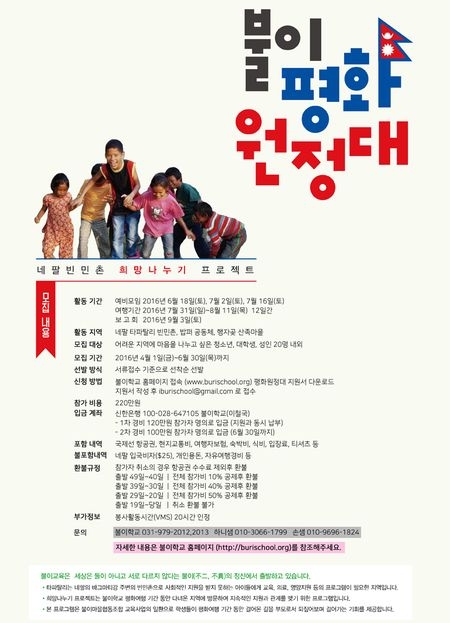 불이학교 관계자는 "이번 '네팔 빈민촌 희망나누기 프로젝트-불이 평화원정대'는 자아정체성 확립과 미래에 대한 설계를 해나가는 청소년기, 대학생들은 물론이고 성인들까지도 함께 할 수 있다"고 전했다.