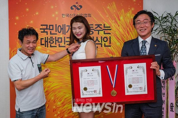 [뉴스인] 민경찬 기자 = 1일 오후 서울 영등포구 여의도동 한국신지식인협회 회의실에서 '2016 대한민국 신지식인' 인증서를 받은 WBA, WBF 슈퍼페더급 챔피언 최현미(가운데)가 전 WBC 라이트플라이급 챔피언 장정구 씨로부터 인증 배지를 받고 있다. 오른쪽은 한국신지식인협회 중앙회 김종백 회장.
