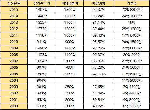 지난 2009년에는 1490억원의 당기순이익 중 1450억원을 배당하며 97.2%의 배당성향을 보였다. 제조업계의 평균 배당성향 20.4%를 크게 웃도는 수준이다.