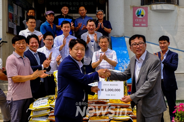[뉴스인] 민경찬 기자 = 굿마이크 LSA 총동문회 최재순 회장(왼쪽)이 29일 경기 고양시 덕양구 대덕동 주민센터에서 열린 '사랑의 쌀' 나눔행사에서 윤세진 미래로 봉사단 윤세진 단장에게 후원금을 전달하고 있다.