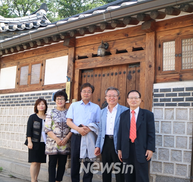 [뉴스인] 민경찬 기자 = 김우영 은평구청장(가운데)이 3일 서울 종로구 북촌한옥마을 선유정을 방문, '연인' 리기태 방패연 명장과 전통연 문화콘텐츠에 관해 협의 후 기념촬영을 하고 있다. 왼쪽부터 이호선 은평구청 문화관광과장, 최상숙 한국연협회 자문위원, 김우영 은평구청장, 리기태 방패연 명장, 정채동 부회장.
