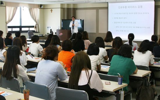 이번 건강강좌에선 원내 환자 및 보호자, 여의도 푸르니어린이집 보육교사 및 직원 70여 명이 참석한 가운데 산부인과 박원일 교수의 강의로 진행됐다.