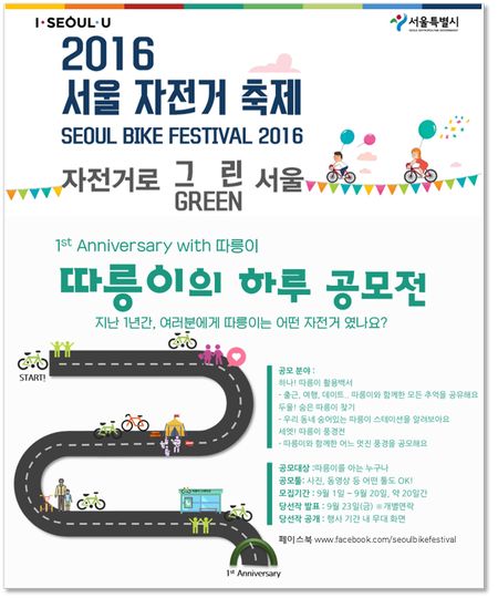 또한 지난해 9월 출범해 13만 회원을 자랑하는 '따릉이' 탄생 1돌을 맞이해 따릉이를 애용하는 시민들의 재미난 에피소드를 담은 사진과 영상을 모아 '따릉이의 하루' 공모전을 개최한다.