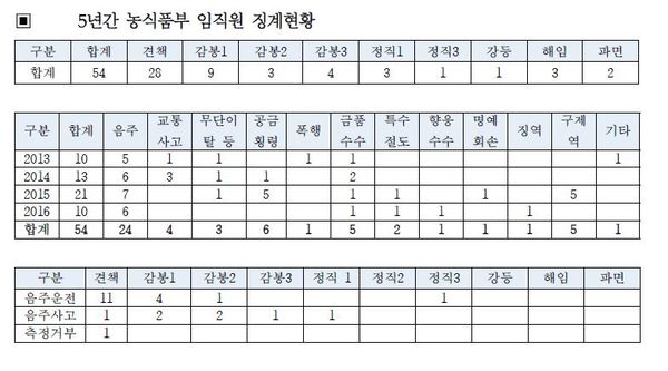 더불어민주당 박완주 의원이 농림부로부터 제출받은 '2013~2016년 임직원 징계현황'에 따르면, 이 기간 동안 해임(파면포함) 5명, 강등 1명, 정직 4명, 감봉 16명, 견책 28명으로 모두 54명이 징계를 받았다.