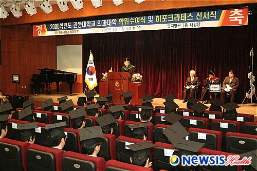 관동대학교 전체 학위수여식은 오는 20일 강릉에서 실시되지만 이에 앞서 이날 거행된 의과대학 학위수여식에서는 모두 50명의 의학과 학생이 졸업했다.