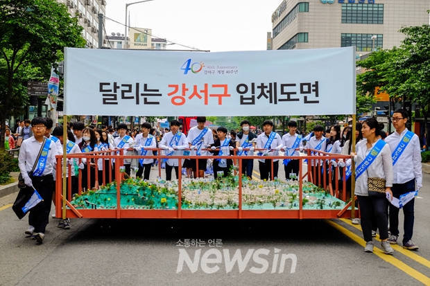 [뉴스인] 민경찬 기자 = 강서구청 개청 40주년 '제9회 강서어린이 동화축제'가 13일 오후 강서구 방화근린공원 일대에서 열린 가운데 '달리는 강서구 입체도면'이 시가 행렬에 참여하고 있다.