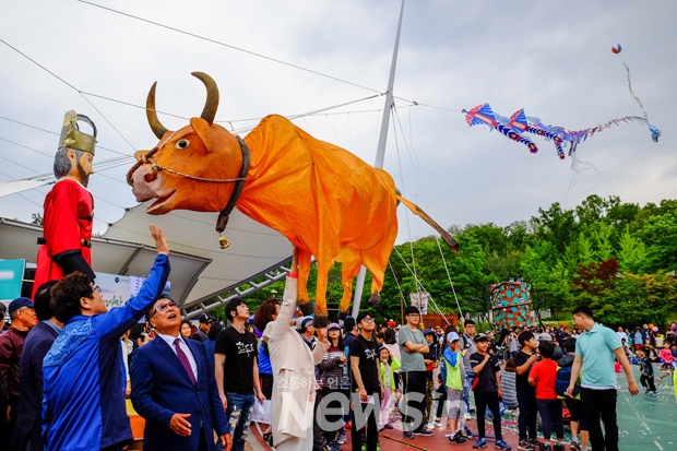 [뉴스인] 민경찬 기자 = 강서구청 개청 40주년 '제9회 강서어린이 동화축제'가 13일 오후 강서구 방화근린공원 일대에서 열린 가운데 한국연협회 리기태 명장의 황소 연이 관계자들의 환송을 받으며 시연되고 있다.