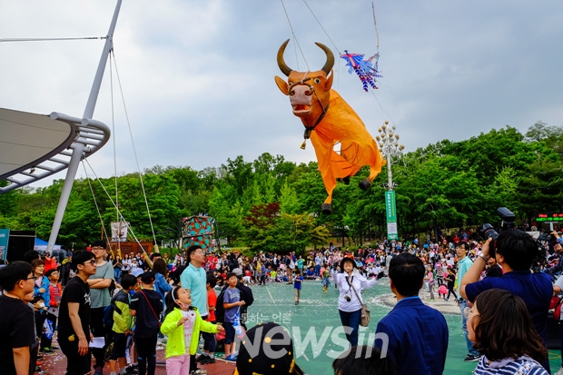 [뉴스인] 민경찬 기자 = 강서구청 개청 40주년 '제9회 강서어린이 동화축제'가 13일 오후 강서구 방화근린공원 일대에서 열린 가운데 한국연협회 리기태 명장의 황소 연이 시연되고 있다.