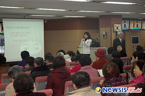 300여명의 회원들이 참석한 가운데 열린 이날 강좌에서 안성형과 신소정 교수는 눈꺼풀이 처져 졸린 눈처럼 보이는 질환인 안검하수의 원인과 검사, 치료 등에 대해 설명한 뒤 질의응답시간을 가졌다.